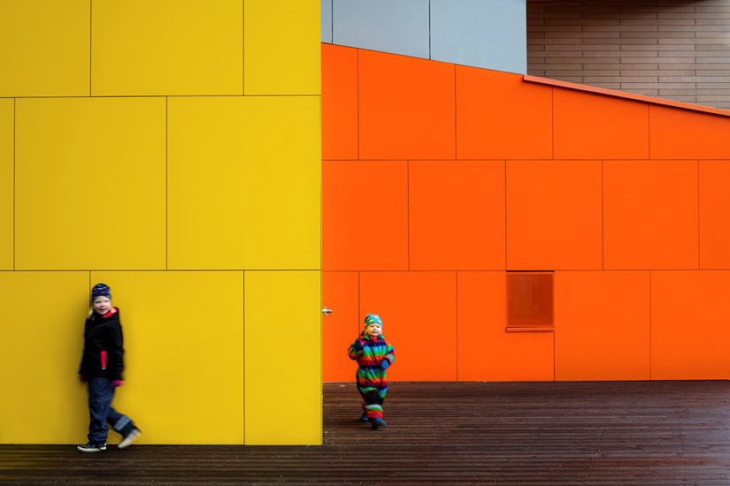 Fasadskivan STENI Colour monterades med lim på delar av förskolans fasad och skapar i kombination med övriga material en innovativ och färgglad miljö.